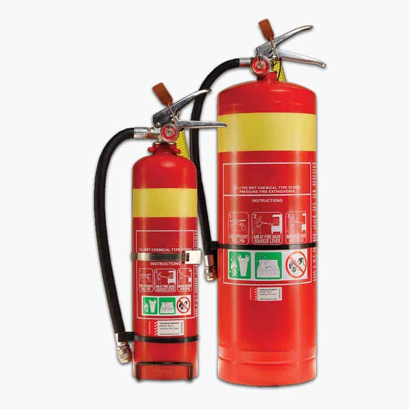 Wet Chemical Fire Extinguishers are for A class and F class cooking oil fires. Wet chemical fire extinguishers are a must in any commercial kitchen with deep fat fryers. Our extinguishers are a true wet chemical unit with a fast acting solution.